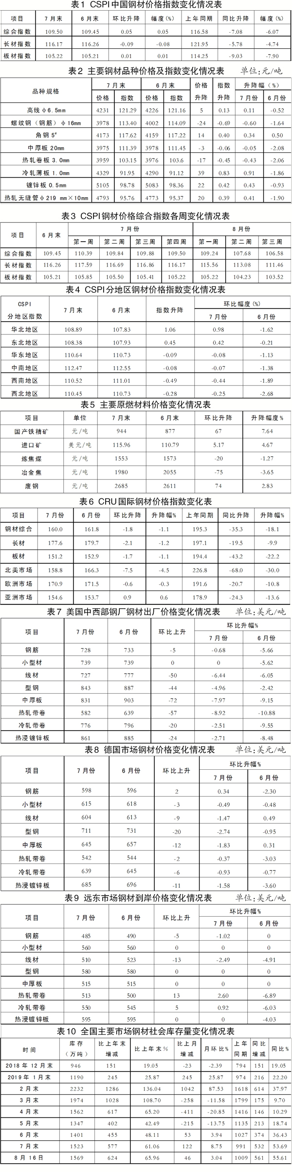 从全月情况看,7月份,CSPI中国钢材价格指数平均值为109.90点,比6月份平均值上升0.91点,升幅为0.83%。