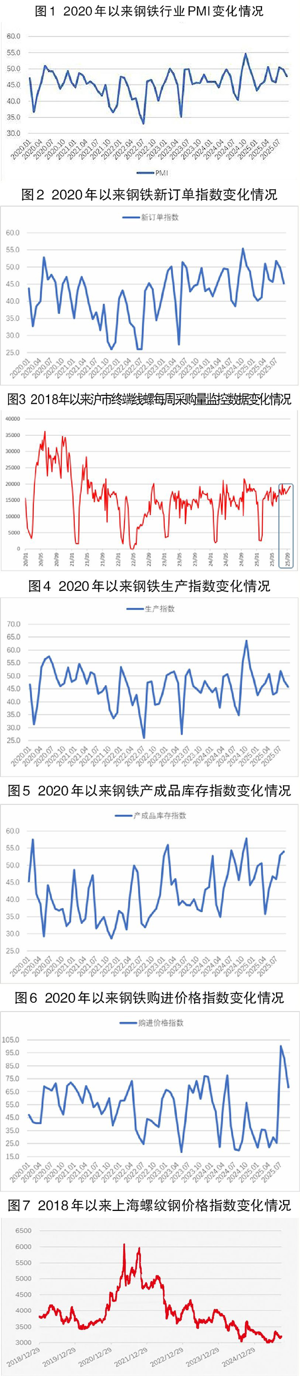 原材料价格继续高位运行,炼钢成本压力持续加大。9月份,由于钢厂生产活动有所放缓,钢厂原材料采购活动同步趋缓,采购量指数环比下降5个百分点至48.5%,结束连续2个月在扩张区间运行态势,并创下第2季度以来的新低,但炼钢原材料价格仍保持高位运行,购进价格指数连续3个月运行在60%以上的高位区间。9月份,分品种来看,铁矿石价格呈现冲高回落运行态势,9月上旬受“反内卷”消息及旺季预期提振,下旬终端需求不及预期导致价格波动下行,但整体较8月份仍有上升;焦炭的供给端持续偏紧,价格继续维持在较高水平;废钢价格也有上升态势。整体来看,9月份的原材料价格继续高位运行,炼钢成本压力持续加大。