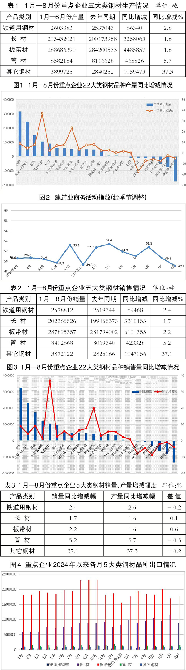 今年前8个月,全国累计生产粗钢6.72亿吨,同比下降2.8%,累计日产276.47万吨;生产钢材9.82亿吨,同比增长5.5%,累计日产404.19万吨。纳入营销月报统计的重点统计钢铁企业(下称重点企业)生产钢材5.07亿吨,同比增长1.9%。重点企业销售钢材5.05亿吨,同比增长2.2%。