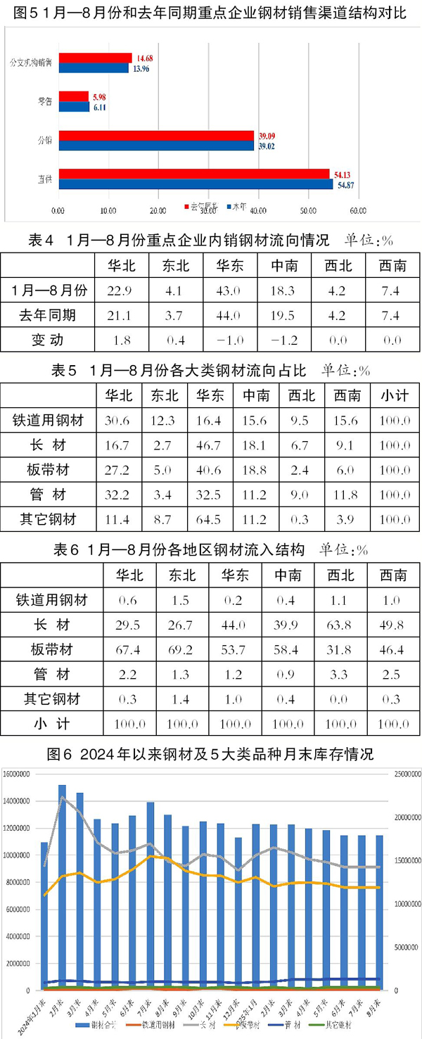 今年前8个月,重点企业钢材内销按照区域流入量统计,华东地区、华北地区、中南地区是主要流入地区,钢材流入合计量占重点企业内销钢材总量的84.3%,比去年同期下降0.4个百分点。