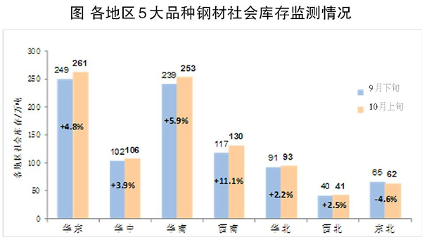 10月上旬,分地区来看,7大区域钢材社会库存除东北地区环比小幅下降外,其他区域均有所上升,其中西南地区上升幅度最大。