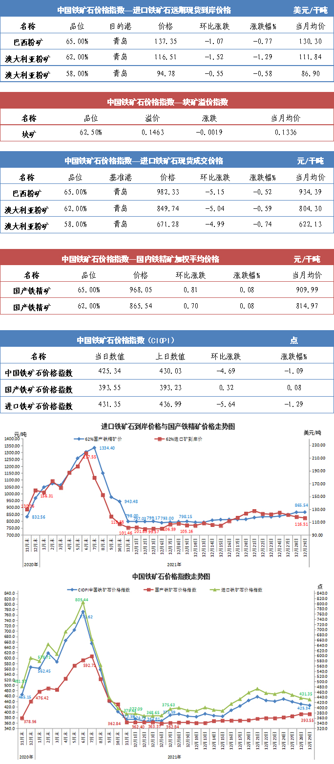 【行业指数】12月29日中国铁矿石价格指数