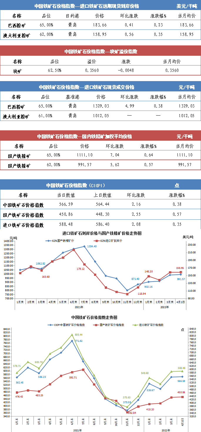 【行业指数】4月1日中国铁矿石价格指数