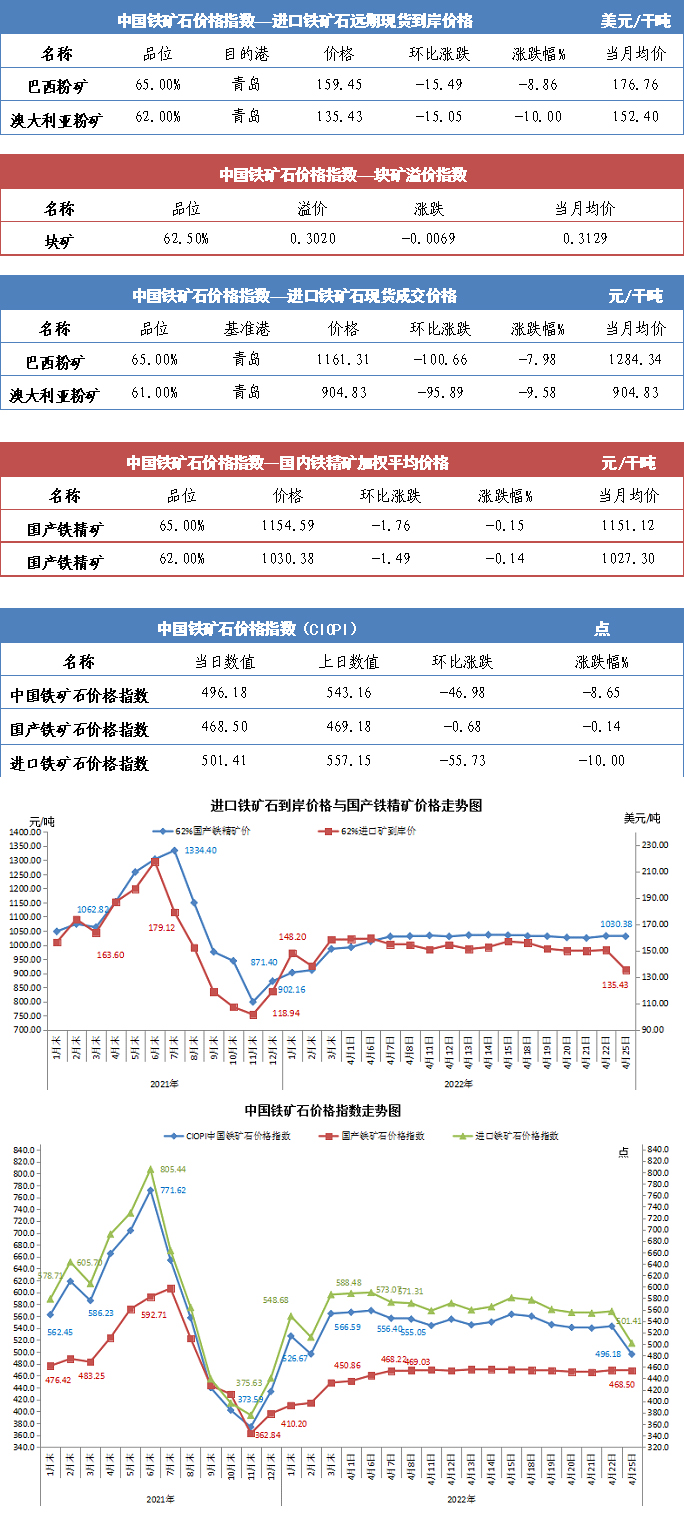 【行业指数】4月25日中国铁矿石价格指数