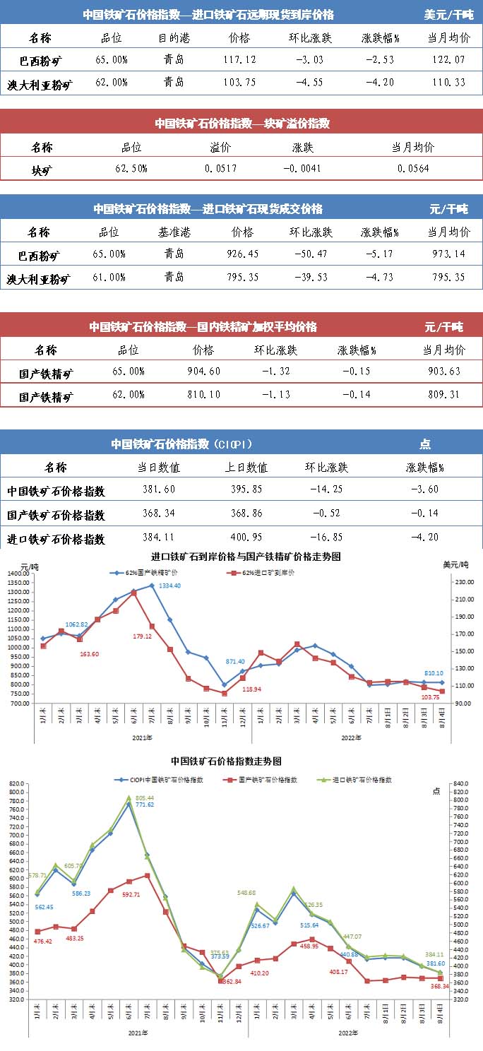 【行业指数】8月4日中国铁矿石价格指数