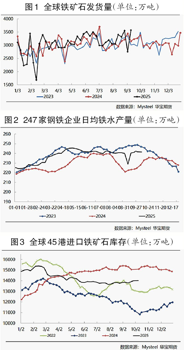 需求方面,10月份以来国内铁矿石需求环比回落但仍保持高位,需求高韧性支撑铁矿石价格。上周(10月6日—10月10日)高炉钢厂产量延续小幅下滑态势,高炉复产发生在河北区域,为前期的高炉检修结束后按计划复产,检修的高炉集中在河北、东北、内蒙古地区,主要以短期检修为主,预计两三周内可进行复产。上周日均铁水产量为241.54万吨(环比减少0.27),国内需求高于8月份平均水平,整体来看,高铁水产量支撑铁矿石价格。第4季度属于季节性需求淡季,但基于当前较好的钢厂盈利面及较强的宏观政策增量预期,预计第4季度铁矿石需求下滑斜率偏小。预估前3个季度生铁产量为6.48亿吨,同比增加3.34%;第4季度生铁产量约为2.17亿吨,同比增加1.1%,环比下降1.7%;2025年全年生铁产量为8.6亿吨,同比增加2.8%。
