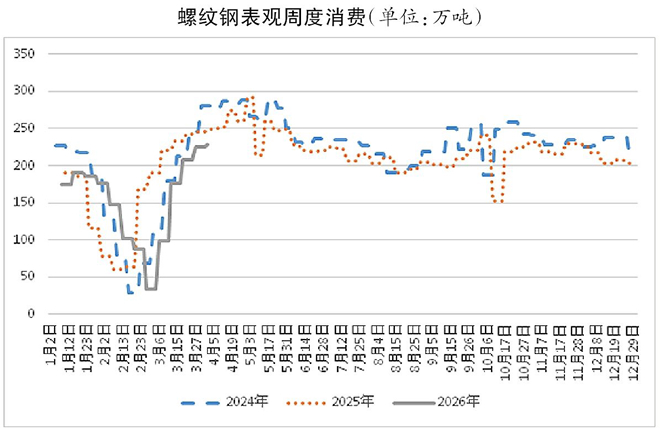 产量回落,库存上升,3月份钢材表观消费情况欠佳。根据上海钢联数据统计,2026年3月初至4月3日的周均表观消费量为187万吨,同比下降21.4%。从消费数据来看,根据上海钢联数据,全国建筑钢材成交量(237家贸易商和需求方的成交量)同比数据表现欠佳,3月份日均成交量为86603吨,同比下降19.6%。