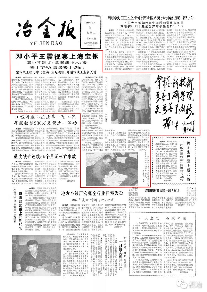 ▲1984年2月21日《冶金报》刊发的邓小平视察宝钢并题词的报道