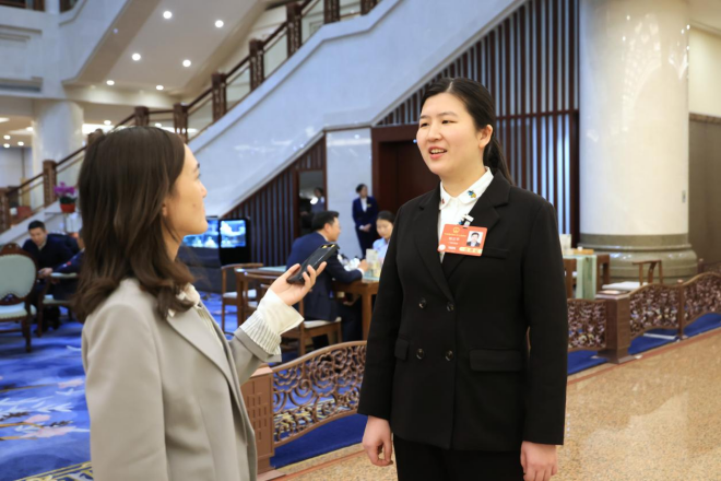图为王艾竹接受中国冶金报社两会报道组记者采访