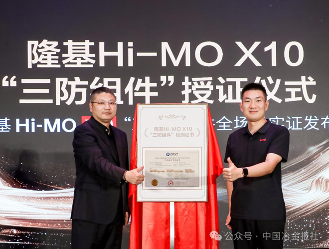 发布会上,CPVT副主任朱晓岗代表CPVT为隆基绿能Hi-MO X10授予“三防”组件检测证书,这是光伏行业首个“三防组件”的权威测试,旨在证明“三防”组件所具备的卓越性能,对促进行业技术进步和高质量发展具有重要意义。