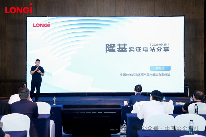 图为隆基绿能中国分布式地区部产品与解决方案总监郭晋维作《隆基实证电站分享》的报告