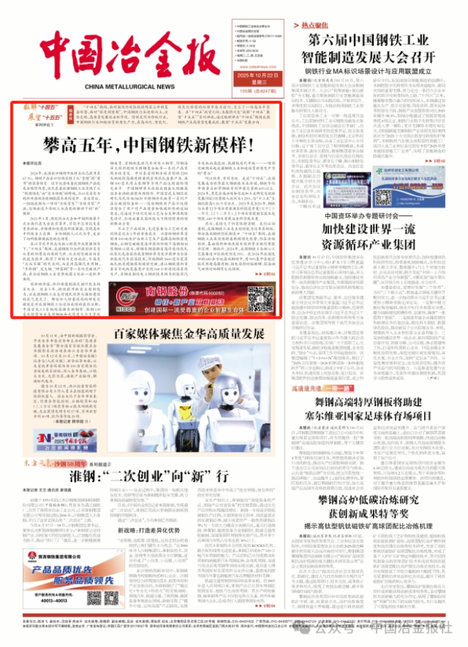 “十四五”的中国钢铁工业在科技创新这一页上写下了厚重的注脚。即将迈入“十五五”,中国钢铁工业仍要以创新为炉、以奋斗为火,淬炼出更多“国之重器”,在全球产业变革浪潮中挺立起钢铁脊梁,让“中国钢铁”成为世界工业舞台上最亮的名片!