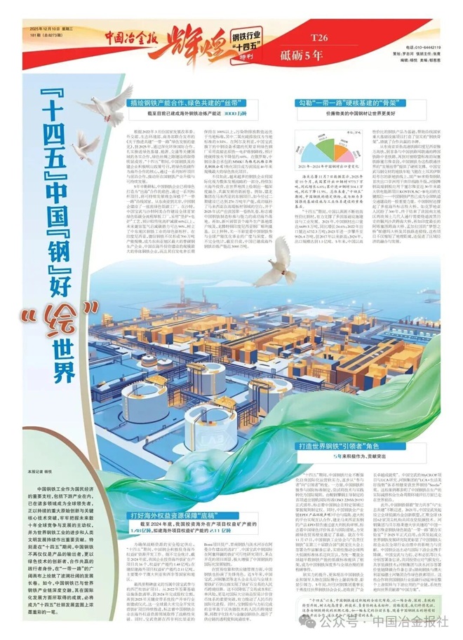 中国钢铁工业作为国民经济的重要支柱,包括下游产业在内,已在诸多领域成为全球领先者,正以持续的重大原始创新与关键核心技术突破,牢牢把握未来数十年全球竞争与发展的主动权,并为世界钢铁工业的进步和人类文明发展持续作出重要贡献。特别是在“十四五”期间,中国钢铁不再仅仅是产品的输出者,更以绿色技术的创新者、合作共赢的践行者身份,在“一带一路”的广阔画布上绘就了波澜壮阔的发展长卷。如今,中国钢铁已与世界钢铁产业链深度交融,其在国际化发展方面所取得的成就,必将成为“十四五”壮丽发展蓝图上浓墨重彩的一笔。