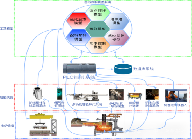 随着互联网、大数据以及检测控制技术的发展,一系列智能化监测技术和控制模型在电炉炼钢过程中得到应用,如智能配料、电极智能调控、智能化取样测温、泡沫渣智能化监测与控制、炉气在线分析及终点温度成分预报等,监测和控制技术的应用大幅度提高了电炉炼钢过程的智能化水平,电炉智能化装备与工艺模型之间的关系如图所示。