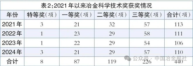 2021年—2024年,我国钢铁行业累计荣获国家科学技术进步奖二等奖3项,分别为“耐火材料功能化与绿色化设计、制备及其对钢铁绿色制造的支撑”“基于二氧化碳资源化利用的绿色洁净炼钢技术及应用”和“大型金属坯料制备电磁调控关键共性技术开发和应用”;共获得冶金科学技术奖440项,其中特等奖8项、一等奖87项、二等奖119项、三等奖226项(2021年以来获奖详情见下表2)。