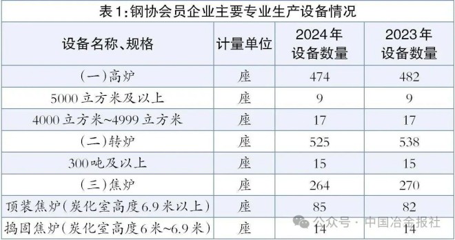 截至2024年末,我国钢铁企业通过产能置换计划建设转炉209座(含已建成装备,下同),其中200吨及以上25座,产能占比为18.7%;电炉161座,其中100吨及以上94座,产能占比为72.1%;高炉238座,其中2000立方米及以上高炉67座,产能占比为42.0%。装备大型化趋势明显,尤其是沿海地区,计划建设的高炉中,容积大于2000立方米的高炉产能占比约为62.7%。此外,计划建设的炼钢产能中,转炉、电炉、AOD炉(氩氧精炼炉)产能占比分别为69.7%、27.2%、3.1%;退出炼钢产能中,转炉、电炉产能占比分别为82%、18%,长流程向短流程转型的趋势显现。(中国钢铁工业协会会员企业主要专业生产设备情况见表1)