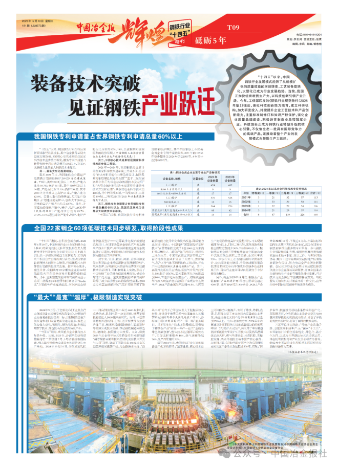 “十四五”以来,我国钢铁行业在科技创新领域取得显著成果,其中冶金装备呈现大型化发展趋势,3项核心技术成果斩获国家科学技术进步奖二等奖,钢铁专利申请量占世界钢铁专利申请总量的60%以上,我国已发展成为世界最大钢铁技术来源国。