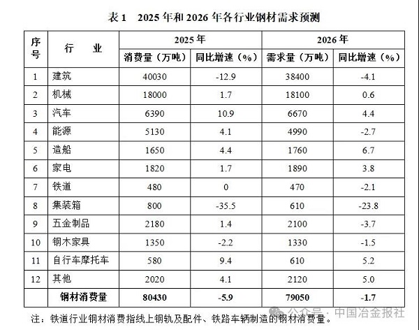 冶金规划院根据钢材消费系数法和下游行业消费法综合预测,2025年我国钢材消费量为8.08亿吨,同比下降5.4%;2026年我国钢材需求量为8亿吨,同比下降1.0%。其中,采用钢材消费系数法预测的结果显示,2025年我国钢材消费量为8.15亿吨,2026年我国钢材需求量约8.13亿吨。采用下游行业消费法预测的结果显示,2025年我国钢材消费量约8.04亿吨,2026年我国钢材需求量约7.91亿吨(详见表1)。