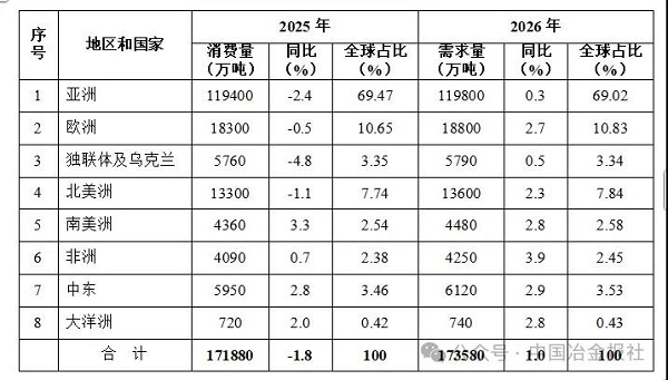 根据冶金规划院对全球及各地区经济发展与钢材需求量的分析,预计2025全球钢材消费量为17.19亿吨,同比下降1.8%;预计2026年全球钢材需求量为17.36亿吨,同比增长1.0%(详见表2)。可以看出,欧洲地区钢材消费全球占比增幅最大,亚洲钢材消费比重虽有下降但仍居全球首位,中东、非洲、南美洲、大洋洲消费占比提高均低于0.10个百分点。