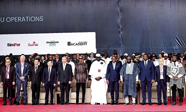当地时间2025年11月11日,西芒杜项目投产启动仪式在几内亚马瑞巴亚港隆重举行(如图)。位于非洲西部几内亚共和国的西芒杜铁矿项目是全球质量最优、规模最大的矿山项目之一,工程涵盖矿山、铁路、港口等系统,总投资逾200亿美元。 (智远 摄)