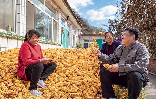 2021年10月14日,河钢唐钢驻承德市滦平县长山峪镇二道营子村工作队队长、第一书记王静泊(右)正与村民攀谈玉米的收成(如图)。河钢唐钢驻二道营子村工作队围绕当地自然生态环境和经济发展环境,因地制宜,推进产业帮扶和消费扶贫,全村面貌得到极大改善,村民生活质量逐步提升。(刘振健 摄)