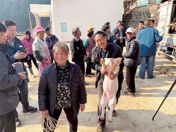 2021年1月14日,云南省宣威市海岱镇腊谷村腊谷庄谢玉凤和家人领到了自己的小猪,她高兴的说,马上要过年了,感谢昆钢送给我们的新年礼物(如图)。2021年初,昆钢驻村工作队投入72.9万元反哺资金,购买405头猪仔发放给村民。宣威市海岱镇月亮田、腊谷村的405户村民自己承担300元,就可以认领一头市场价1800元猪仔进行饲养。(王天俊/文 陈正华/摄)