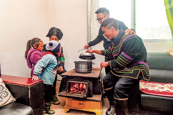 2020年10月28日,四川省凉山州喜德县乐武乡达洛村鞍钢集团攀钢扶贫干部杜传(右二)正在指导阿苦说布(右一)使用生物质炉,至此阿苦说布一家人告别沿袭上千年的彝族“火塘”,过上窗明几净的新生活。阿苦说布嘴里不停地说:“攀钢,瓦吉瓦!(彝语很好的意思)”。“十四五”期间,攀钢已向喜德、盐源、盐边等扶贫点捐赠1500余台生物质炉。 (特约通讯员 梁建伟 摄)
