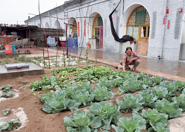 2020年6月11日,山西省保德县腰庄乡铺房墕村村民陈秋梅在自家院子里高兴地“摆弄”自种的各种蔬菜(如图)。2020年,太钢扶贫工作队进驻后,实施引水入户工程,惠及全村102户村民。用水方便了,村民们开始在院子里种植有机瓜果蔬菜,搞起了“菜园子”,实现了日常菜品自给自足,仅此一项工程平均每户每年可降低生活支出800至1000元。(记者 王旭宏 摄)