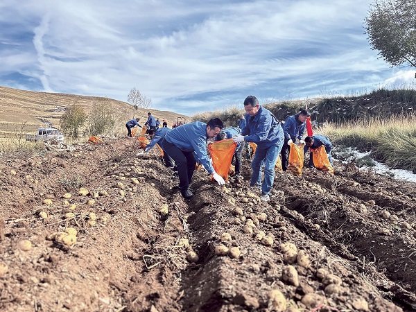 2023年10月中旬以来,甘肃省武威市古浪县山区气温急剧下降,酒钢集团帮扶乡镇古浪县横梁乡部分农户土豆面临滞销。酒钢乡村振兴驻村帮扶工作站快速响应,组织全体驻村干部在古浪县南部山区马铃薯种植基地开展“为民办实事”帮销活动。在此次活动中,酒钢乡村振兴驻村帮扶工作站共计帮销马铃薯35余吨。图为酒钢驻村干部在帮助村民收土豆。(王斌先 摄)