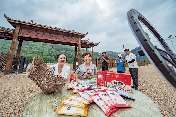 2023年6月26日,辽宁省本溪市桓仁县黑沟乡石虎子村村民在本钢驻村工作队员张研(右)指导下,正在生态蓝莓农庄进行电商直播带货(如图)。2023年2月份以来,鞍钢集团本钢通过电商培育打好“帮扶牌”,投入专项资金对定点帮扶村的70余名村民进行了电商直播培训。“农产品+主播”成为助农帮扶的重要推手,让村民走上了电商销售新战场,带动了村里蓝莓、鸭蛋、小米等农副产品的热销。(郑开耀 高晓曦/文 杨镇/摄)
