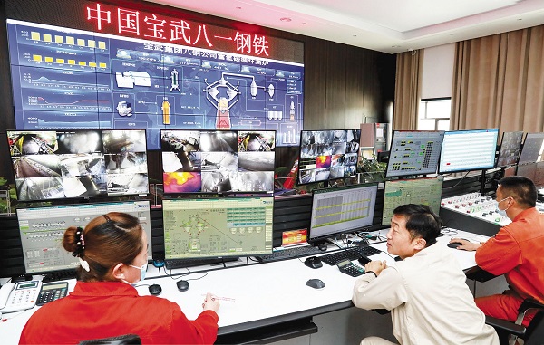 2021年,中国宝武八钢富氢碳循环高炉成功实现50%高富氧冶炼目标。图为八钢富氢碳循环高炉操作室一角。 (姚海山 摄)