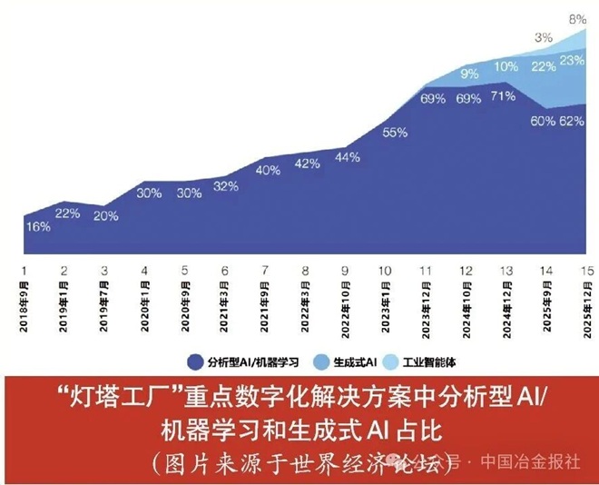 最初几年里,“灯塔工厂”评选企业提报的重点数字化解决方案中,分析式AI(人工智能)和机器学习技术比例较低。2023年以后,随着人工智能技术的飞速发展,分析式AI和机器学习技术占比显著提高,在此基础上,生成式AI和工业智能体技术逐步进入应用阶段,新“灯塔工厂”普遍将智能决策直接嵌入核心业务流程,并在整个组织的深度应用中,更加系统地对生态韧性进行了强化。