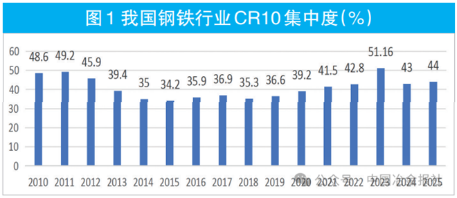 截至2025年底,我国钢铁行业CR10(前十大钢企粗钢产量占比)、CR4分别达到44%、28%,较“十三五”末分别提高4.8个百分点、5.7个百分点(详见图1)。虽然近年来钢铁行业集中度有了很大提高,但仍处于高度竞争、高度分散、供给弹性过大的状态。另外,长期的低集中度导致钢铁行业对资源和定价权的掌控能力弱。