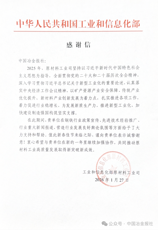 2026年1月27日,工业和信息化部原材料工业司向中国冶金报社发来感谢信,感谢报社在钢铁行业政策宣传、先进技术经验推广、行业重大新闻报道、营造行业发展良好舆论氛围等方面给予的大力支持和帮助,并希望双方在未来的工作中,继续加强协作,共同推动原材料工业高质量发展不断取得新突破、新成效。