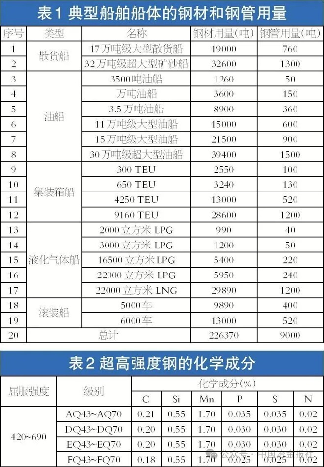 船体用钢主要有低碳钢、高强度钢、超高强度钢、特殊钢和铸钢(典型船舶船体的钢材和钢管用量见表1)。其中,超高强度钢通常指经过调质处理(淬火+回火)的高强度钢,其化学成分见表2。此外,船体制造还大量应用各类特殊钢,主要包括超低温钢、耐腐蚀钢、抗层状撕裂钢(Z向钢)、抗裂纹钢和低磁钢等。