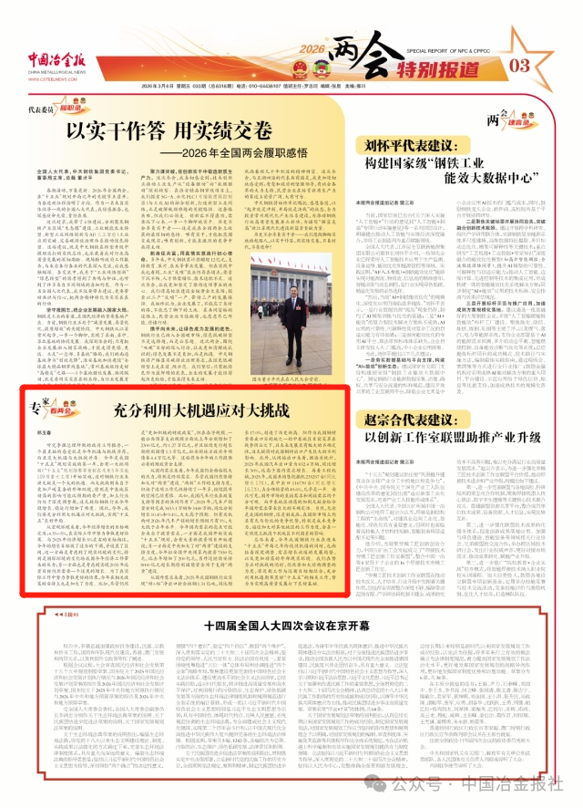 听完李强总理所做的政府工作报告,一个最直接的感受就是今年机遇与挑战并存,而且是大机遇与大挑战并存。今年是我国“十五五”规划实施的第一年,会有一大批项目(“十五五”规划纲要草案拟在未来5年实施109项重大工程)开始实施,这对钢铁行业来讲无疑是一个大的机遇。而大挑战则来自于更加严峻复杂的外部环境,特别是中东地区动荡的影响可能比预期的要严重,加上行业仍处于深度调整期,这无疑给钢铁行业今年稳增长、稳运行增加了难度。因此,今年,我们要充分利用大机遇应对大挑战,实现“十五五”良好开局。