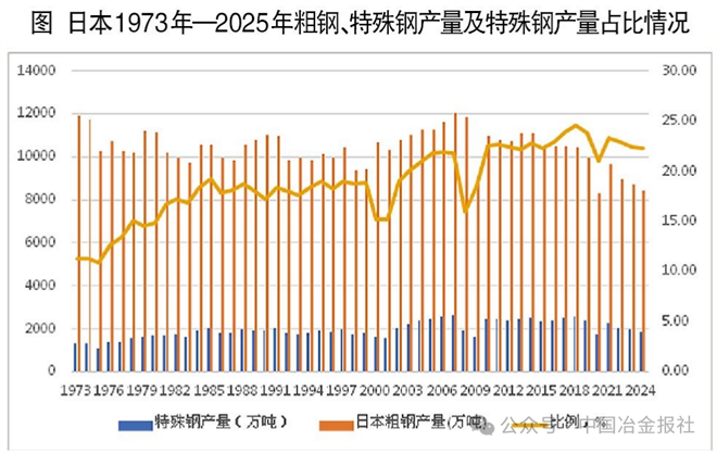 但与此同时,其产品结构发生变化,特钢占比逐渐增大,从1973年的1338万吨增长到2018年的最高值2559万吨,占粗钢比例从1973年的11.22%增长到2018年的最高值24.53%。2025年,日本粗钢产量为8068万吨(详见图)、位列全球第四,而特钢产量达1821万吨,占比高达23%。更令人瞩目的是,日本特钢占全球市场的份额为33%,这样的成绩离不开日本长达百年的技术积累、专利布局以及及时的结构优化。