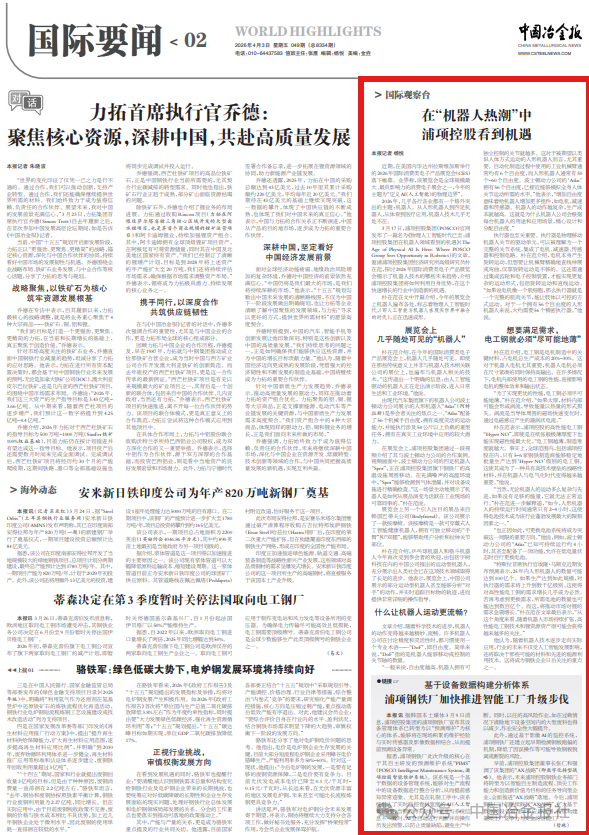 3月17日,浦项控股集团(POSCO)官网发布了一篇名为《物理人工智能时代已至:浦项控股集团在机器人领域看到的机遇》(The Age of Physical AI Is Here: Where POSCO Group Sees Opportunity in Robotics)的文章,邀请浦项控股集团经济研究所高级研究员朴在范,探讨2026年国际消费类电子产品展览会揭示了机器人技术的哪些未来趋势,介绍浦项控股集团将如何利用自身优势,在这个快速增长的行业中创造新的机遇。