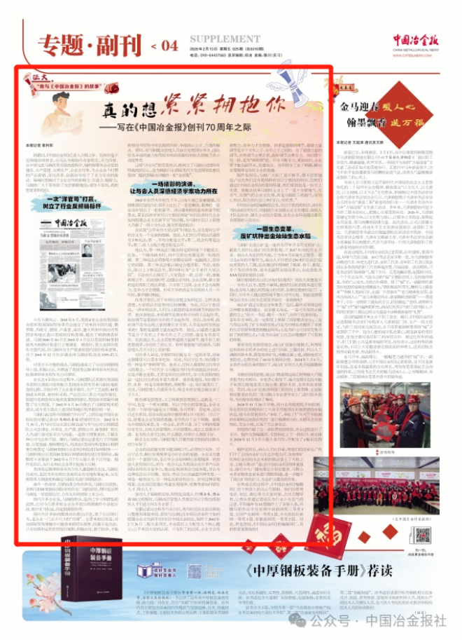 转眼间,《中国冶金报》创立已经70周年。70年来,她始终青春焕发,活力四射。在中国宝武马钢改革发展的进程中,她积极服务企业党的建设、生产管理、文明生产、企业文化等,为企业各个时期的产品营销、深化改革、创新创效给予了有力有效的推动。每每回想她对于企业宣传的影响力、穿透力、辐射力,马钢的广大干部和职工发自肺腑地说:爱你不容易,真的想紧紧拥抱你。