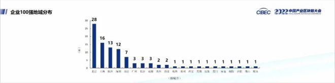 2021年度中国产业区块链企业100强中,从所在城市来看,北京市最多,有28家;从所在区域来看,华东地区最多,有39家;从所在省份来看,北京市最多,有28家。