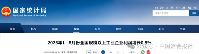 9月27日,国家统计局公布了2025年1—8月份全国规模以上工业企业利润数据。