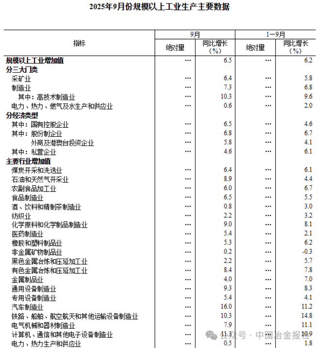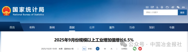 10月20日,国家统计局网站发布《2025年9月份规模以上工业增加值增长6.5%》一文。