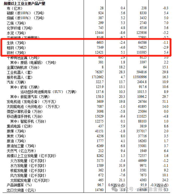 1-9月份,我国粗钢产量74625万吨,同比下降2.9%;生铁产量64586万吨,同比下降1.1%;钢材产量110385万吨,同比增长5.4%。