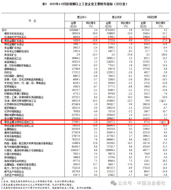 1-9月份,主要行业利润情况如下:电力、热力生产和供应业利润同比增长14.4%,有色金属冶炼和压延加工业增长14.0%,农副食品加工业增长12.5%,计算机、通信和其他电子设备制造业增长12.0%,电气机械和器材制造业增长11.3%,通用设备制造业增长8.4%,专用设备制造业增长6.8%,非金属矿物制品业增长5.1%,汽车制造业增长3.4%,黑色金属冶炼和压延加工业同比由亏转盈,利润总额为973.4亿元,石油煤炭及其他燃料加工业同比减亏,化学原料和化学制品制造业下降4.4%,纺织业下降5.9%,石油和天然气开采业下降13.3%,煤炭开采和洗选业下降51.1%。