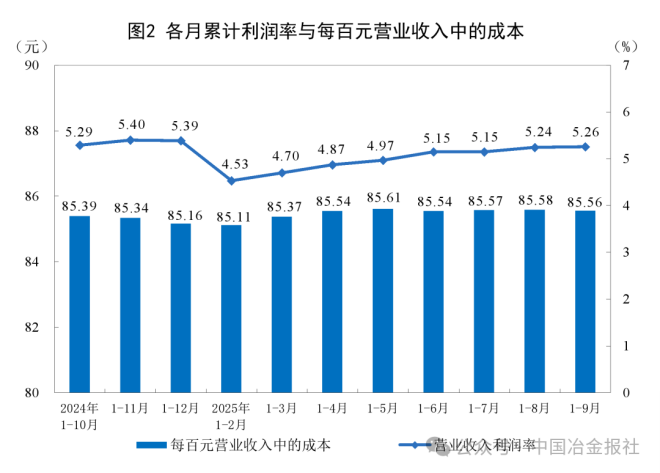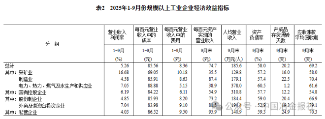 1—9月份,规模以上工业企业每百元营业收入中的成本为85.56元,同比增加0.18元;每百元营业收入中的费用为8.36元,同比减少0.16元。
