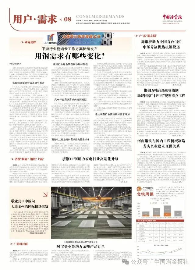 近期,工业和信息化部、国家发展改革委、国家能源局、自然资源部、生态环境部、住房城乡建设部、水利部等部门相继印发下游用钢行业稳增长工作方案(2025—2026年),并积极推进落实。这一系列政策在钢铁及钢材贸易领域引起广泛关注。业内普遍认为,随着相关方案的贯彻实施,下游用钢需求有望进一步释放。