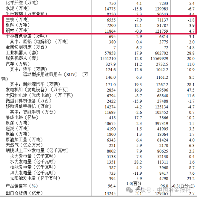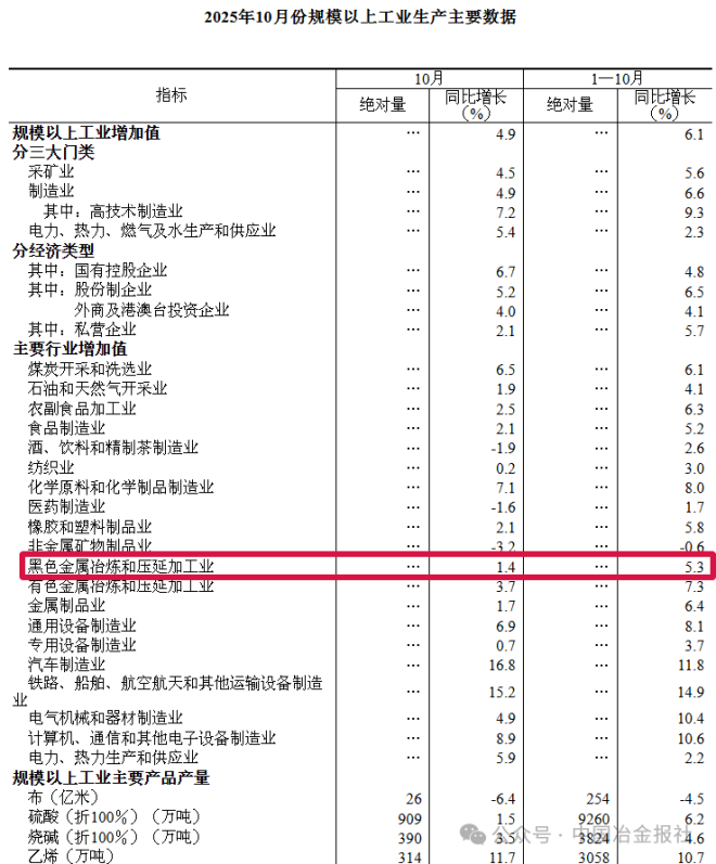 1-10月份,我国粗钢产量81787万吨,同比下降3.9%;生铁产量71137万吨,同比下降1.8%;钢材产量121759万吨,同比上升4.7%。