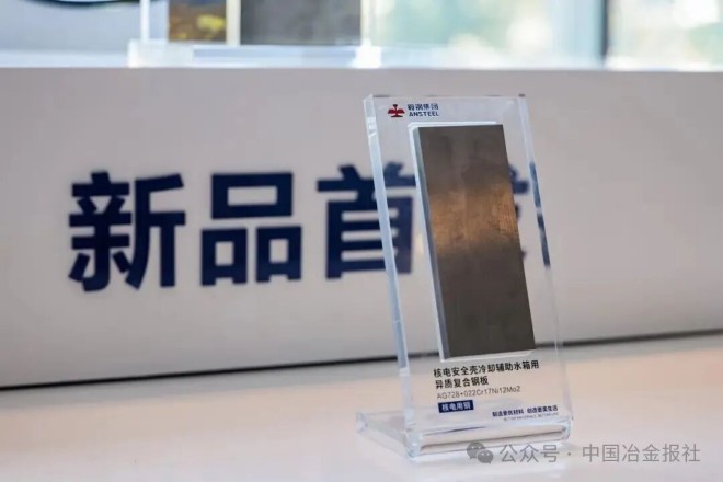 核电安全壳冷却辅助水箱用异质复合钢——AG728+022Cr17Ni12Mo2:鞍钢集团联合设计单位历时2年研制,率先应用于3代非能动压水堆核电机组。与奥氏体不锈钢相比,抗拉强度大幅提升,综合成本显著下降。攻克组坯焊接、超宽板幅等难题,成功生产宽度3700mm超宽规格产品,通过严苛焊接与应用评价。