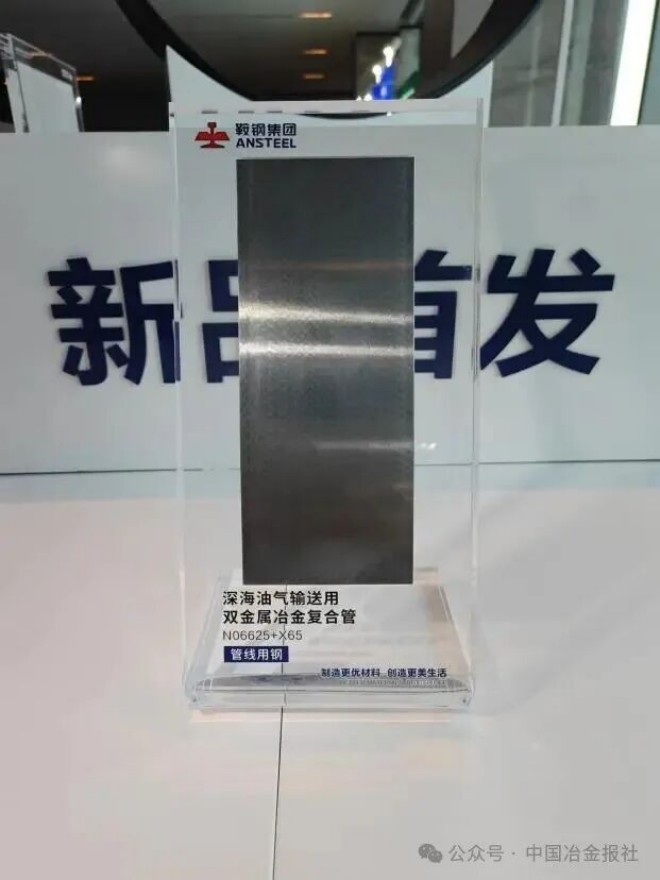 深海油气输送用双金属冶金复合管用钢——N06625+X65:由鞍钢集团牵头联合10余家单位研发,依托工信部项目,采用X65管线钢与N06625镍基合金轧制复合制成。兼具基层高强韧性与覆层耐腐蚀性,经钢研纳克检测达标,通过EPD环保认证。采用真空组坯及轧制复合技术,减少厚板开坯工序,经JCO成型制成大口径复合管,填补国内空白。适配深海高腐蚀环境,为深海油气资源开发筑牢输送“生命线”。