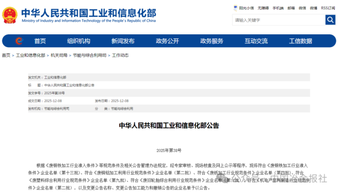 12月8日,工业和信息化部网站发布相关公告,公布了2025年度符合废钢铁、废铜铝、废纸、废塑料、废旧轮胎等再生资源综合利用行业以及机电产品再制造行业规范条件企业名单。